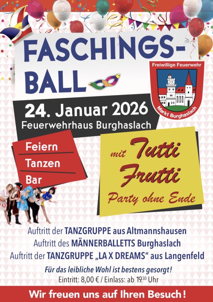 Schnappt euch eure Kostüme und lasst es bei unsererem Faschingsball krachen… 🚒🎉🥂 Für eine narrische Stimmung sorgen Tutti Frutti, das Männerballet Burghaslach, die Showtanzgruppe Altmannshausen, und LA X DREAMS. Wir freuen uns auf euren Besuch!